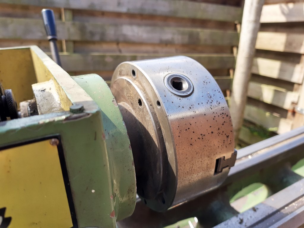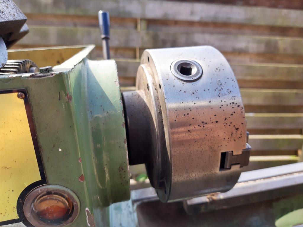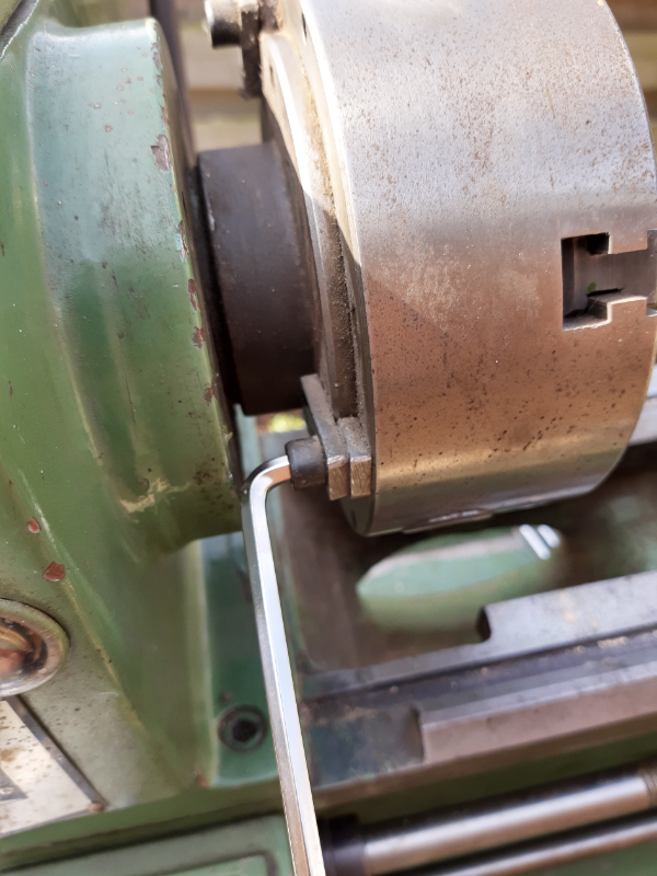 Die imbusboutjes zetten de drieklauw waarschijnlijk vast ok de flens, zal allemaal wel vast zitten na al die tijd.