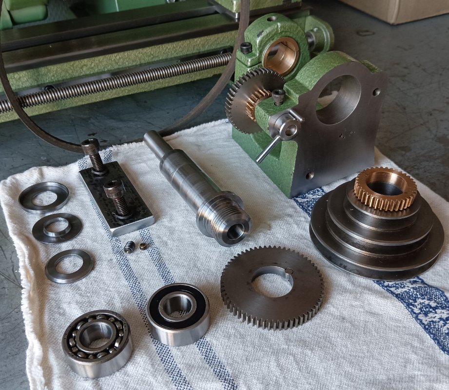Zoals op de onderstaande foto's te zien, is het voorste lager een bronzen glijlager. Het gietstuk van de vaste kop is aan een kant ingezaagd. Met de inbusbout door deze inkeping kan het glijlager strakker worden aangeklemd. Van het achterste lager kan ik niet vaststellen wat dit is. De groene ring rond de hoofdas lijkt van een soort kunststof. Er zit in het achterlager ook geen oliekanaal. Het achterste tandwiel van het dubbelwerk zit vast op de as (ik vermoed met een spie), de andere vormt een geheel met de poelies, die met een borgschroef op de as kunnen worden vastgezet.
