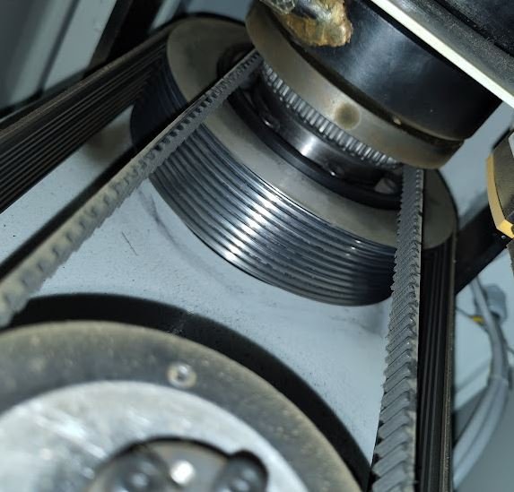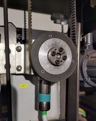 1. Op de hoofdspindel een tandriemschijf monteren maar deze moet dan minimaal 150mm doorsnede zijn. (anders kan ik hem niet monteren)