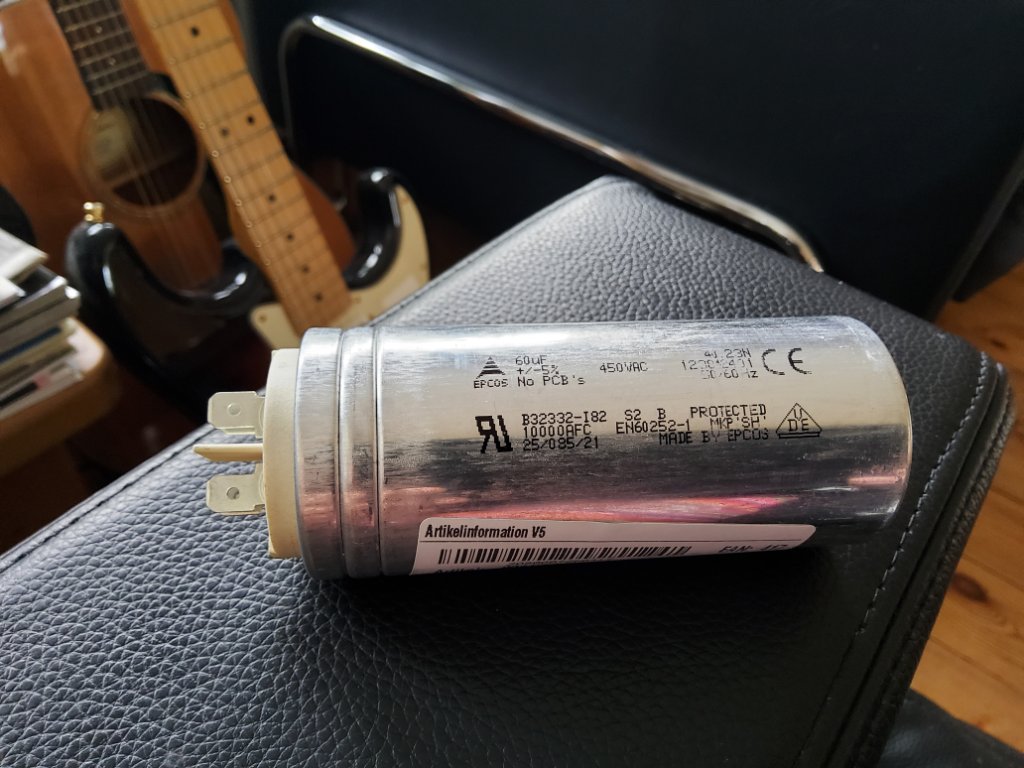 Inmiddels heb ik maar weer een nieuwe condensator besteld, deze keer een TDK wat volgens de specs een echte "run" of bedrijfscondensator is wat ook nodig is omdat de condensator in het circuit blijft tijdens bedrijf (geen centrifugaal schakelaar)